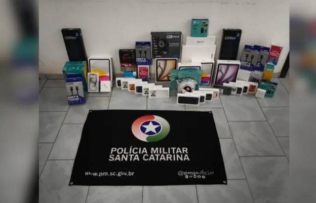 Durante a busca no Jeep Compass, os policiais encontraram eletrônicos escondidos sob os bancos e dentro de um travesseiro. Foram localizados cinco iPhones, um MacBook, iPads e acessórios, avaliados em cerca de R$ 84 mil no mercado nacional.