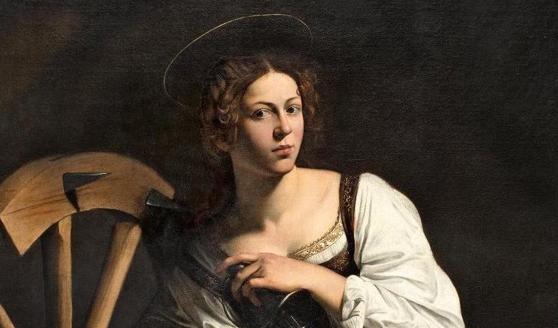 A narrativa também aponta que foi condenada à morte após resistir às pressões políticas e religiosas. A tradição cristã relata que a execução ocorreu por decapitação, depois que um instrumento de tortura conhecido como “roda” teria se quebrado durante a tentativa de punição, em 305 d.C., quando tinha 18 anos. Por esse motivo, a santa costuma ser representada com a roda e a espada em pinturas e esculturas religiosas (veja a imagem abaixo).