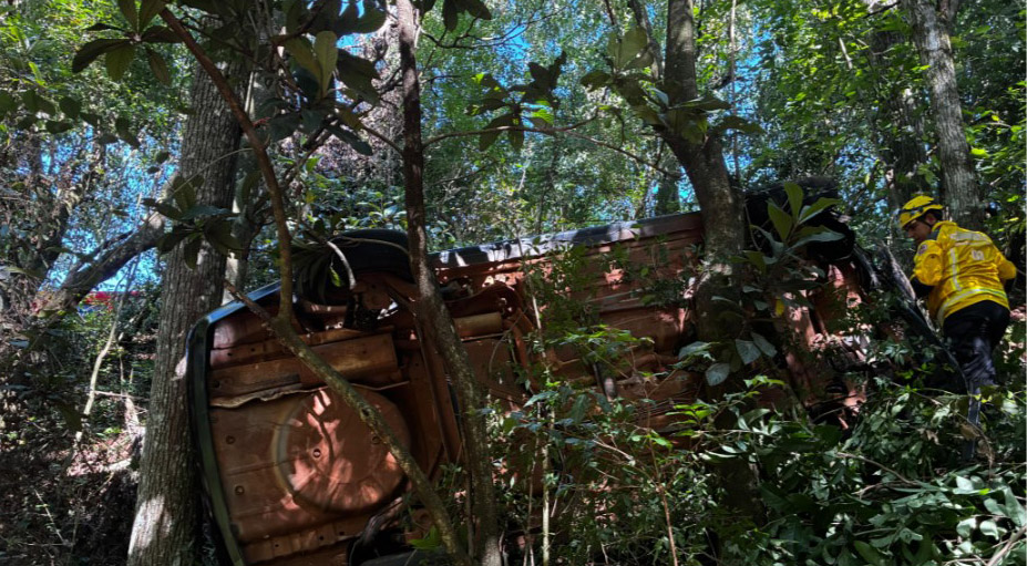 No local, os bombeiros encontraram a vítima já fora do carro, sentada à margem da via. O condutor relatou que perdeu o controle do veículo ao tentar ligá-lo, o que provocou a saída de pista e a queda. Ele apresentava escoriações pelo corpo, queixava-se de fortes dores na região lombar e tinha cortes provocados pelo contato com os vidros do automóvel.