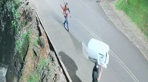 Imagens de câmeras de monitoramento mostram o momento em que três homens, que caminhavam pela via, percebem a ausência de moradores e acessam rapidamente o pátio do imóvel. Em menos de um minuto, eles retiram uma máquina de lavar roupas, um par de tênis e duas cadeiras de plástico, deixando o local logo em seguida.
