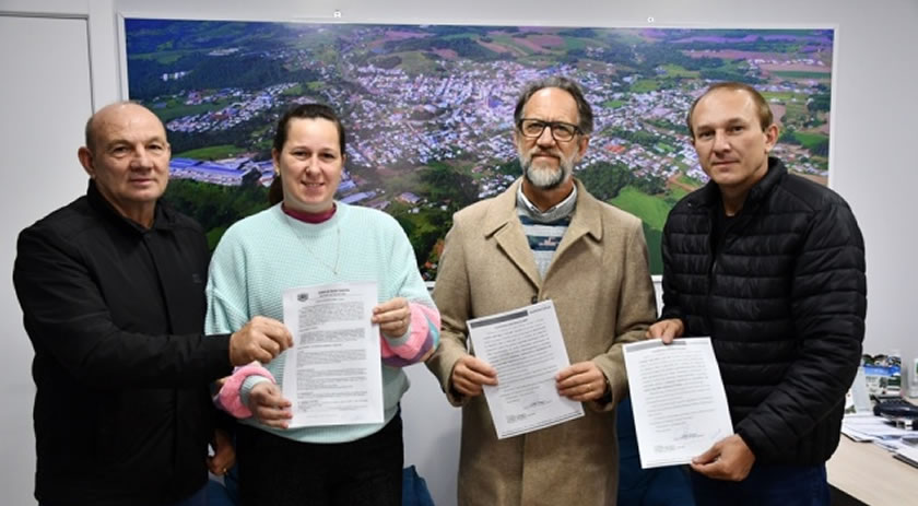 Também estiveram presentes na assinatura do contrato o vice-prefeito, Domingos Marcon, a secretária de Educação, Sandra Gasperin, a secretária de Administração, Gracieli Maldaner, a arquiteta da prefeitura, Josiana de Maman, e o representante do Harmonia, Fernando Degasperin.
